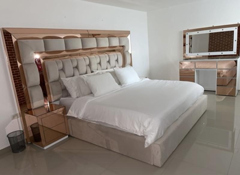 Cama 1.60 mt *1.90 mt, doble marco enchapado en espejo, dos mesas de noche riel push up enchapadas en espejo