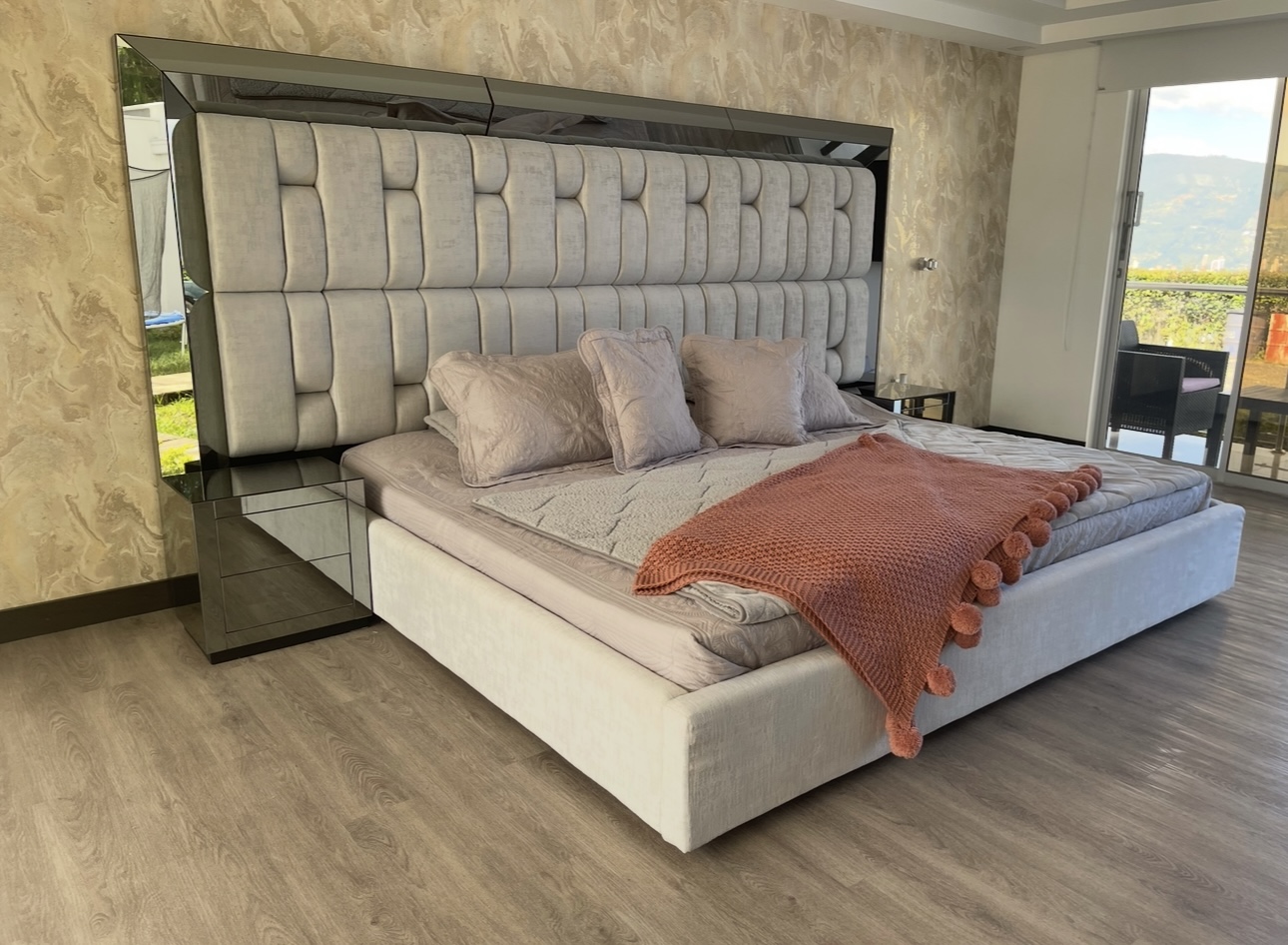 Cama 1.60 mt *1.90 mt marco enchapado en espejo, espaldar medida 2.70 mt *1.80 mt, dos mesas de noche riel push up enchapadas en espejo