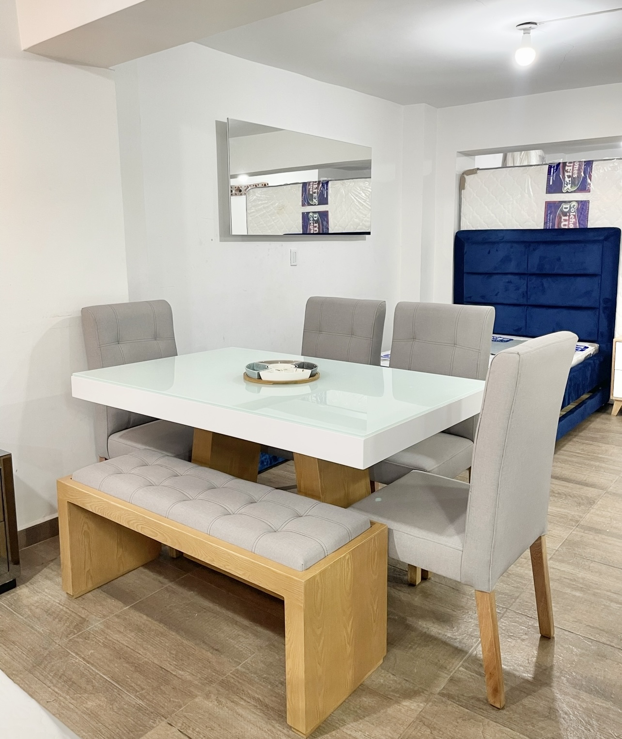 Comedor Estonia moderno (6) seis puestos fabricado en madera roble y Enchape Roble, silla tapizada lisa en blanco, negro y otros colores.