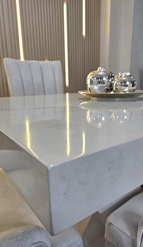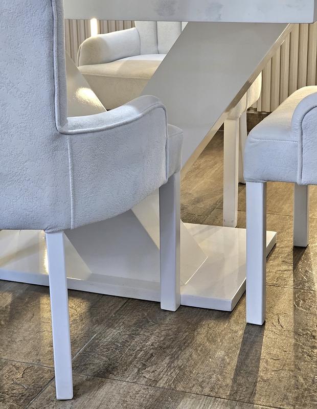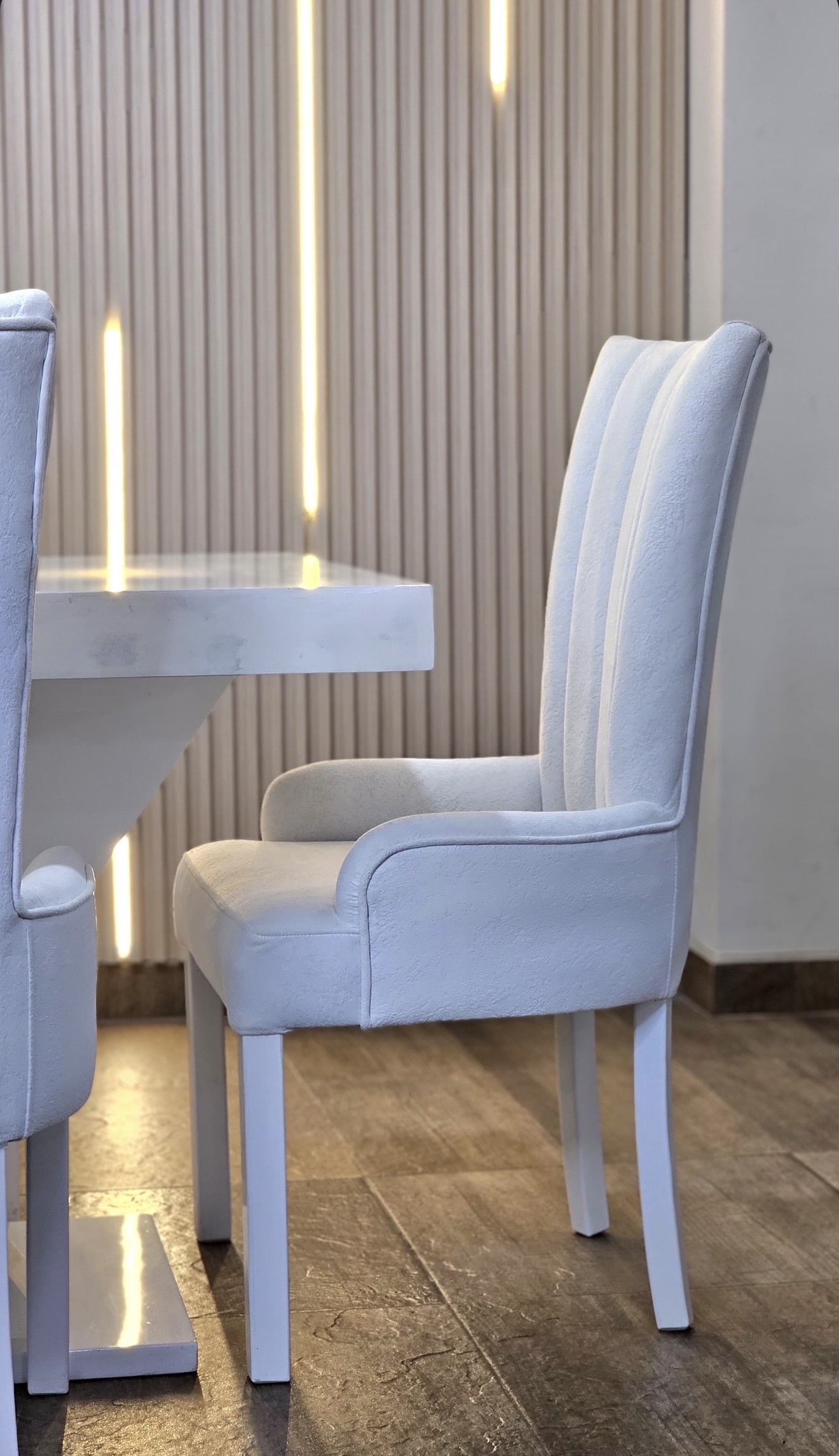 Comedor compuesto por una mesa dimensiones 1.20 cm *90 cm, alto 80 cm, elaborado en roble y MDF,4 sillas en roble tapizadas capitoneadas con espuma de alta densidad, decoradas con estoperoles, pintado poliuretano