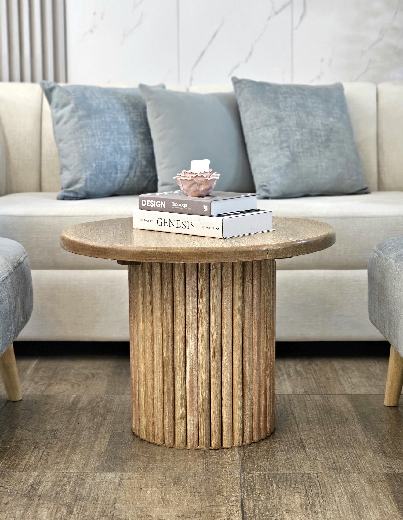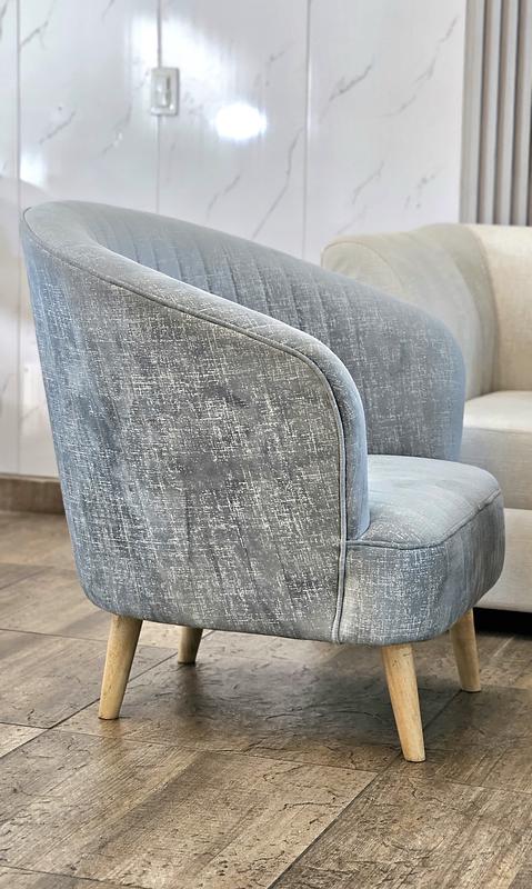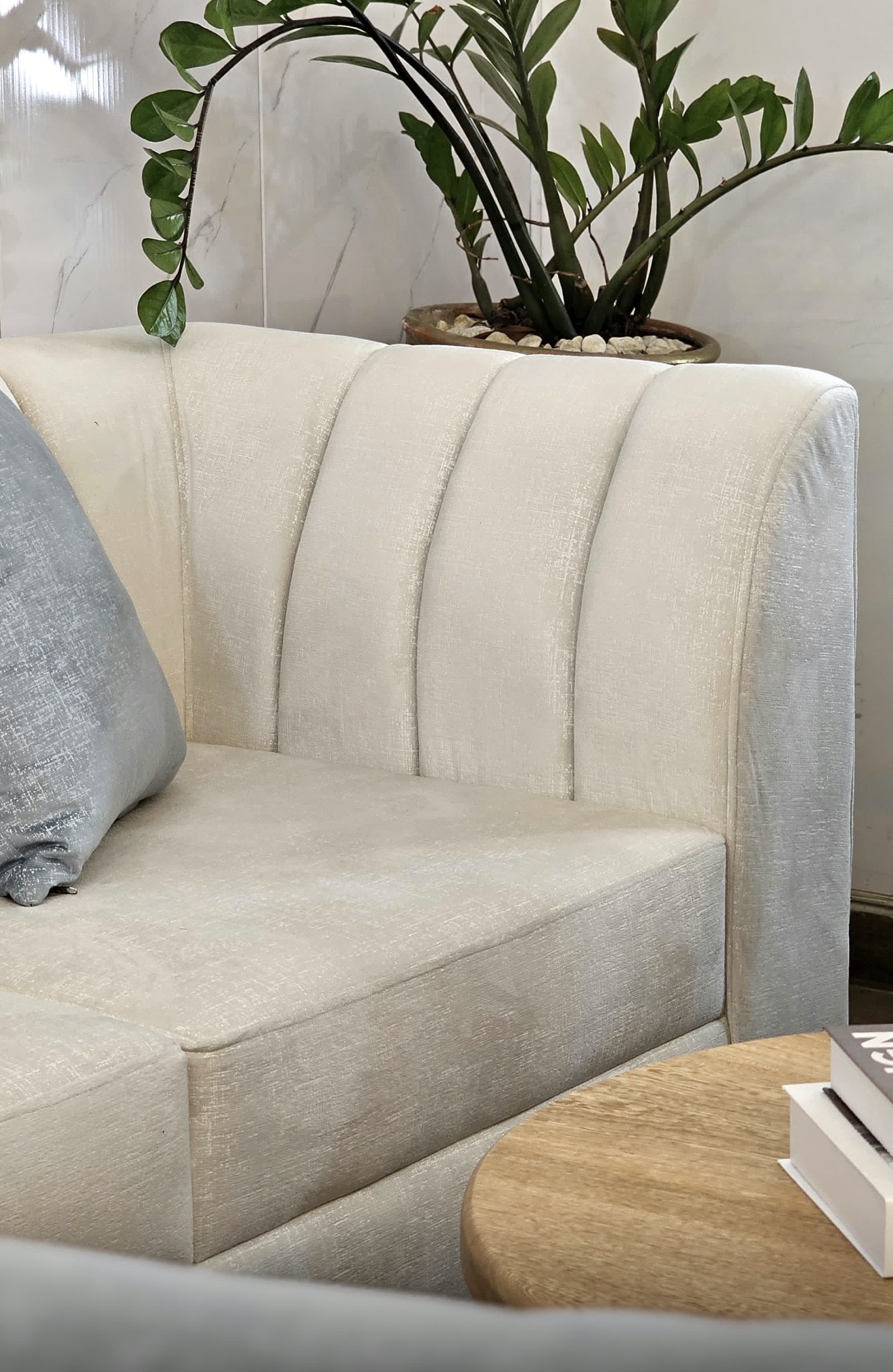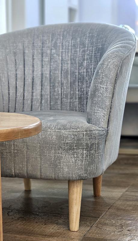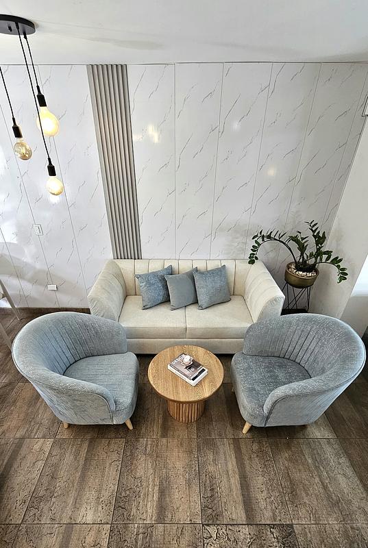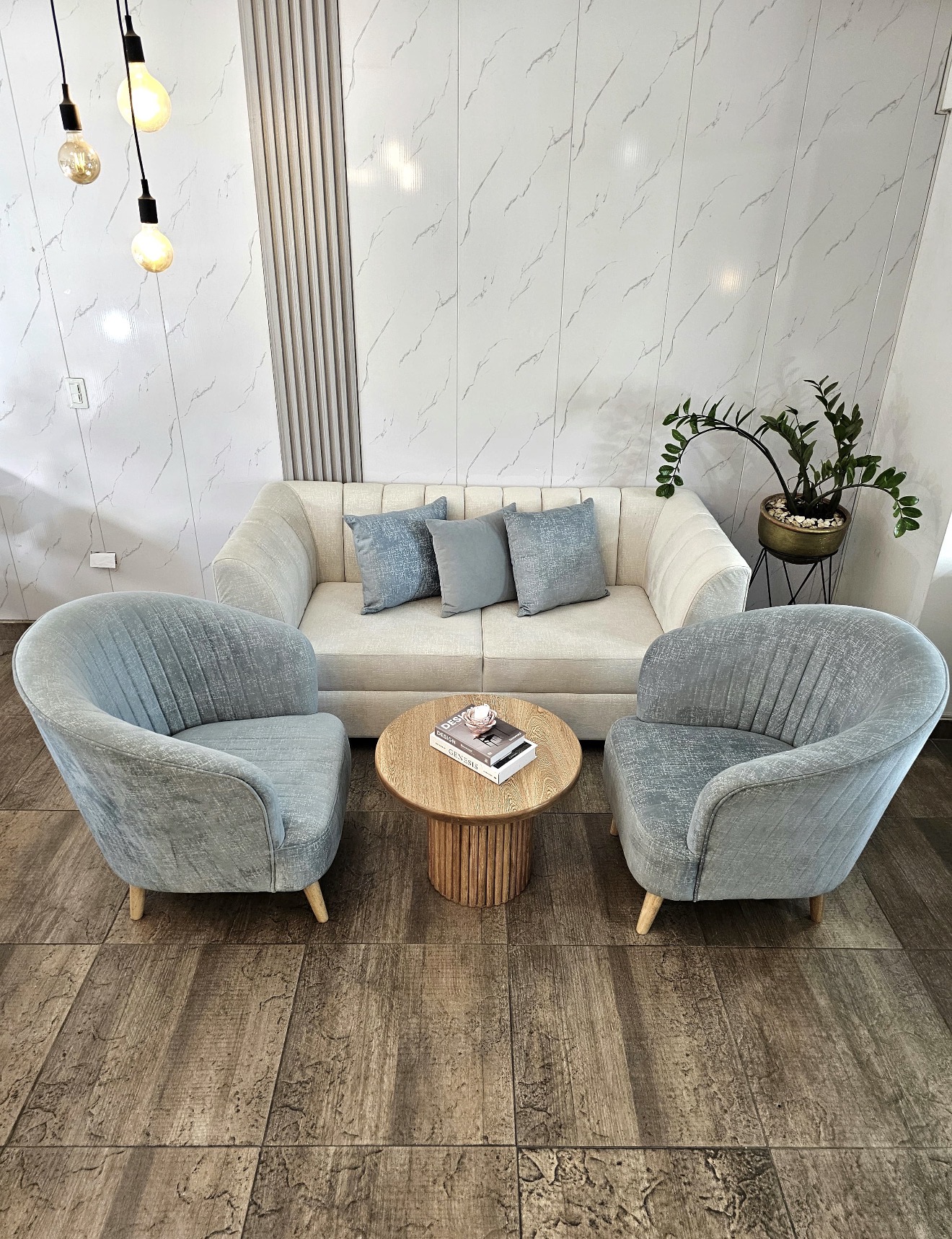 Sofá Monaco medida 1.80 Mt ancho, dos poltronas Mónaco tapizadas con pata cónica, mesa de centro Mónaco en roble